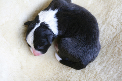 09.03.2012: Am 65. Tag der Trächtigkeit kommen die Welpen - sehnsüchtig erwartet - endlich zur Welt! Insgesamt sind es 4 Hündinnen und 2 Rüden, alle schwarz-weiß, alle über 400 Gramm schwer. Die Geburt verlief leicht und unkompliziert, Panda kümmert sich rührend um ihren Nachwuchs. Einzelfotos und Infos zu den Welpen folgen! :-) Foto unten: Gerade mal ein paar Stunden alt...